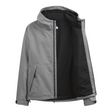 - Attached, three-piece hood with a drawcord