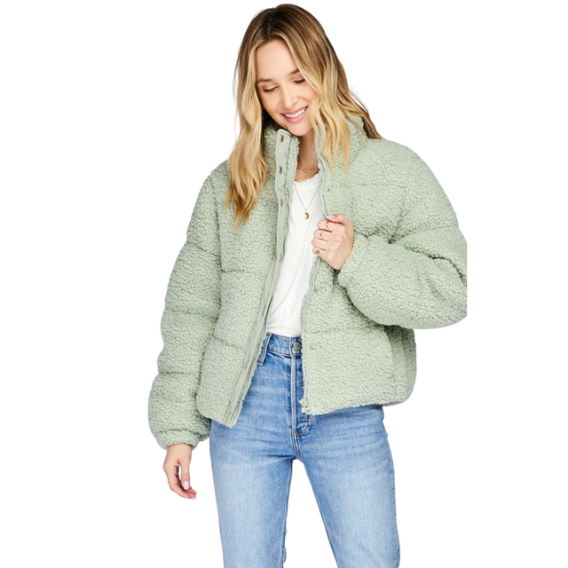 The Ellis is a classic puffer silhouette reimagined in a faux shearling fabric. The jacket is fully lined and features inseam pockets, elasticated sleeve cuffs, and a front closure with zipper and snaps.