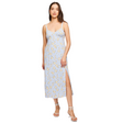Light blue midi dress featuring pale yellow floral print, spaghetti straps, and shirred elastic back for comfort and flexible sizing!