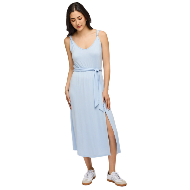 The Solange dress is made of super soft EcoVero rayon jersey. Features include a knotted strap detail and removable belt.
