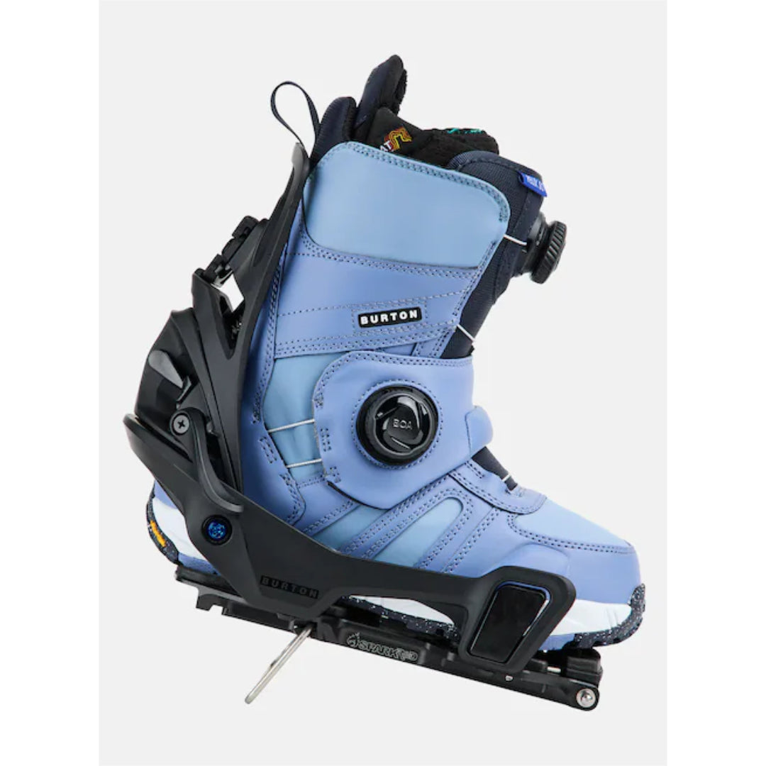 Fewer moving parts means less to worry about. The men's Burton Step On® Splitboard Bindings bring the ease and simplicity of our Step On system to the backcountry. Based on the same easy-to-use Spark Tesla mounting system as our Hitchhiker binding, the Step On model mounts quickly and creates a secure connection between the boot heel and binding in tour mode that makes for an efficient stride on the skin track and reduces boot wear. Less fussing equals faster transitions and more time riding.